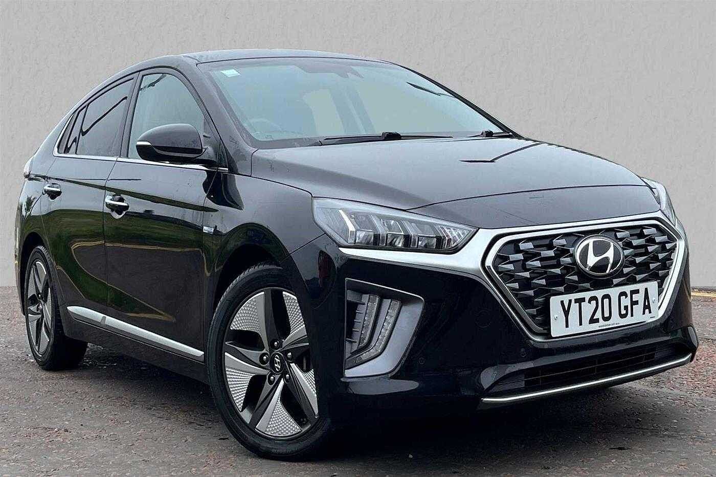 Hyundai IONIQ 1.6 GDi (105ps) Premium SE Hybrid DCT 5Dr HB finished in Phantom Black with black leather matching interior. Specification includes dual zone climate control, power assisted steering (pas), rear parking camera parking aid, computer, front/rear heated seats, cruise control, driver electric seat lumbar support, 60/40 split rear folding seats, remote central door locking, trip computer, immobiliser, 12v auxillary power socket, 17in alloy wheels, amplifier sound processor, anti-lock brakes, automatic headlamps, bluetooth connectivity, bluetooth interface telephone equipment, climate control, driver, driver/passenger seat height adjustment, electric heated/folding door mirrors, electronic stability programme, foglights, front armrest, front heated seats, front/rear electric windows, front/rear head restraints, ipod/mp3 connectivity, multi functional steering wheel, parking camera, parking distance control - front and rear, passenger and front side air bags, rear spoiler and tinted glass.