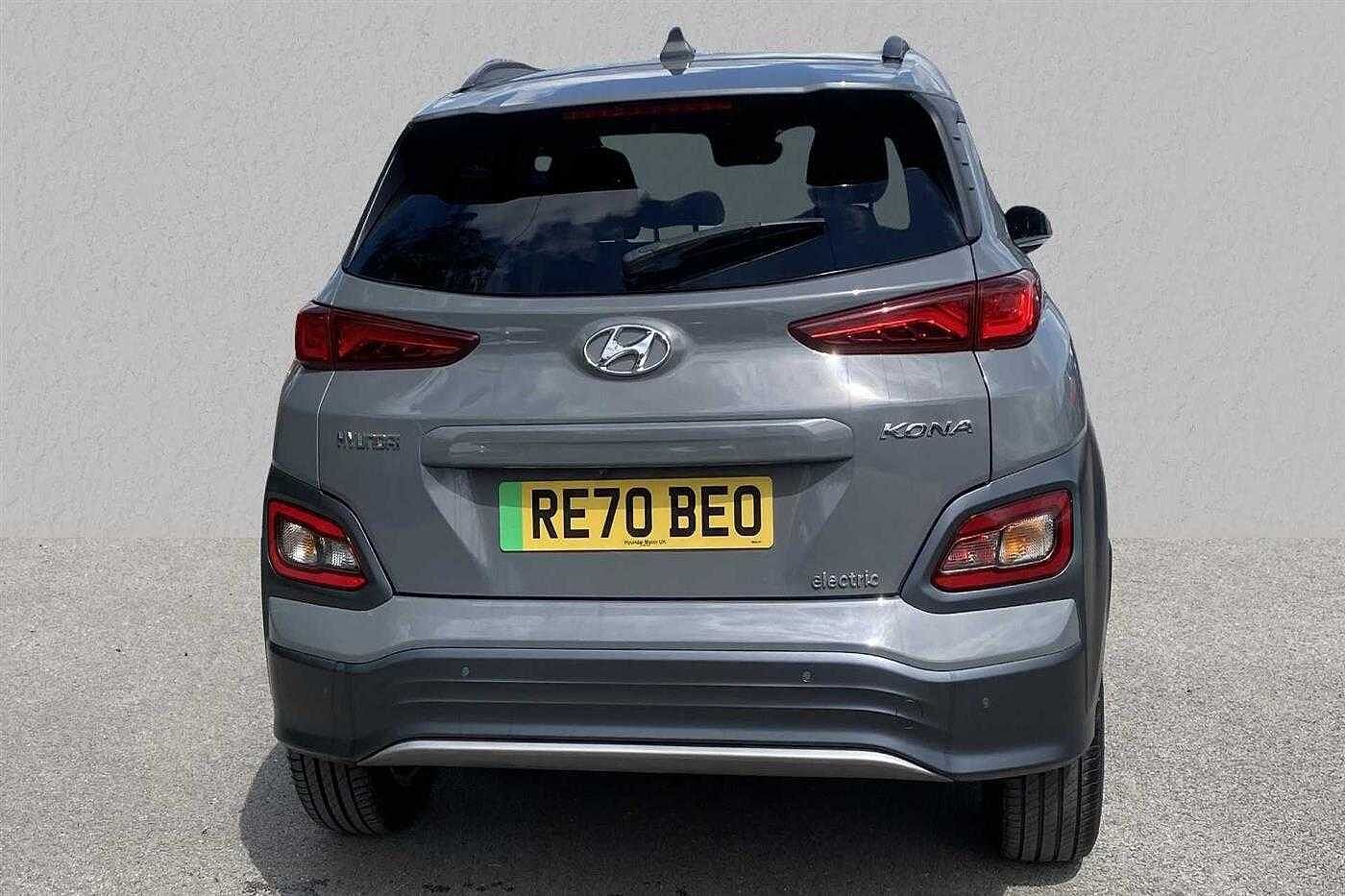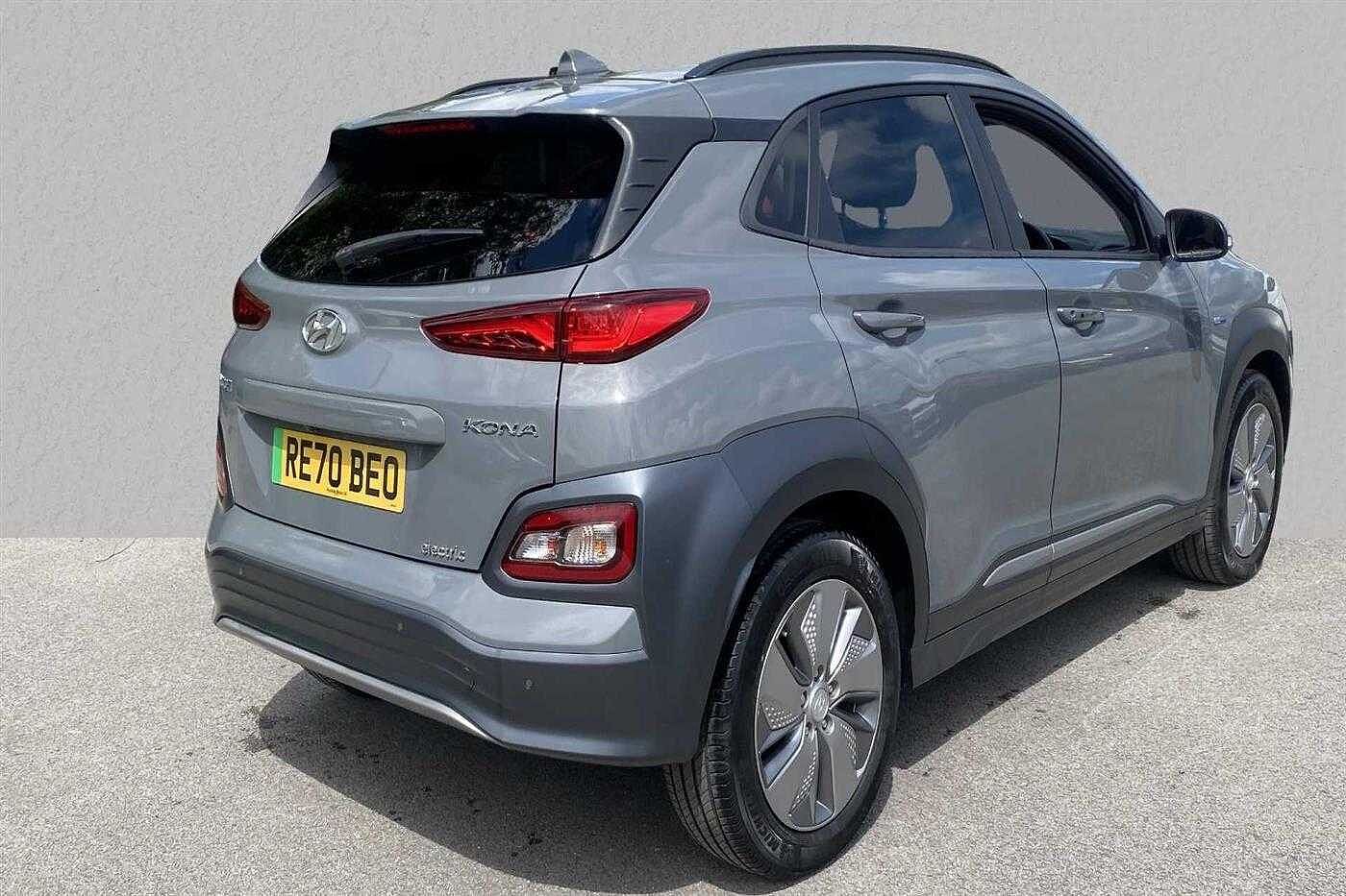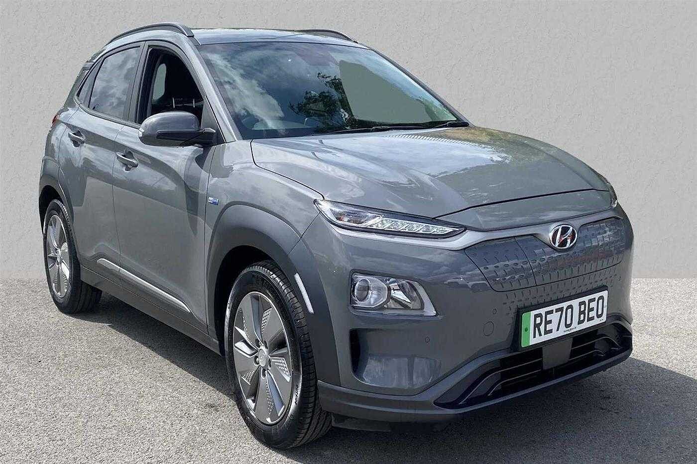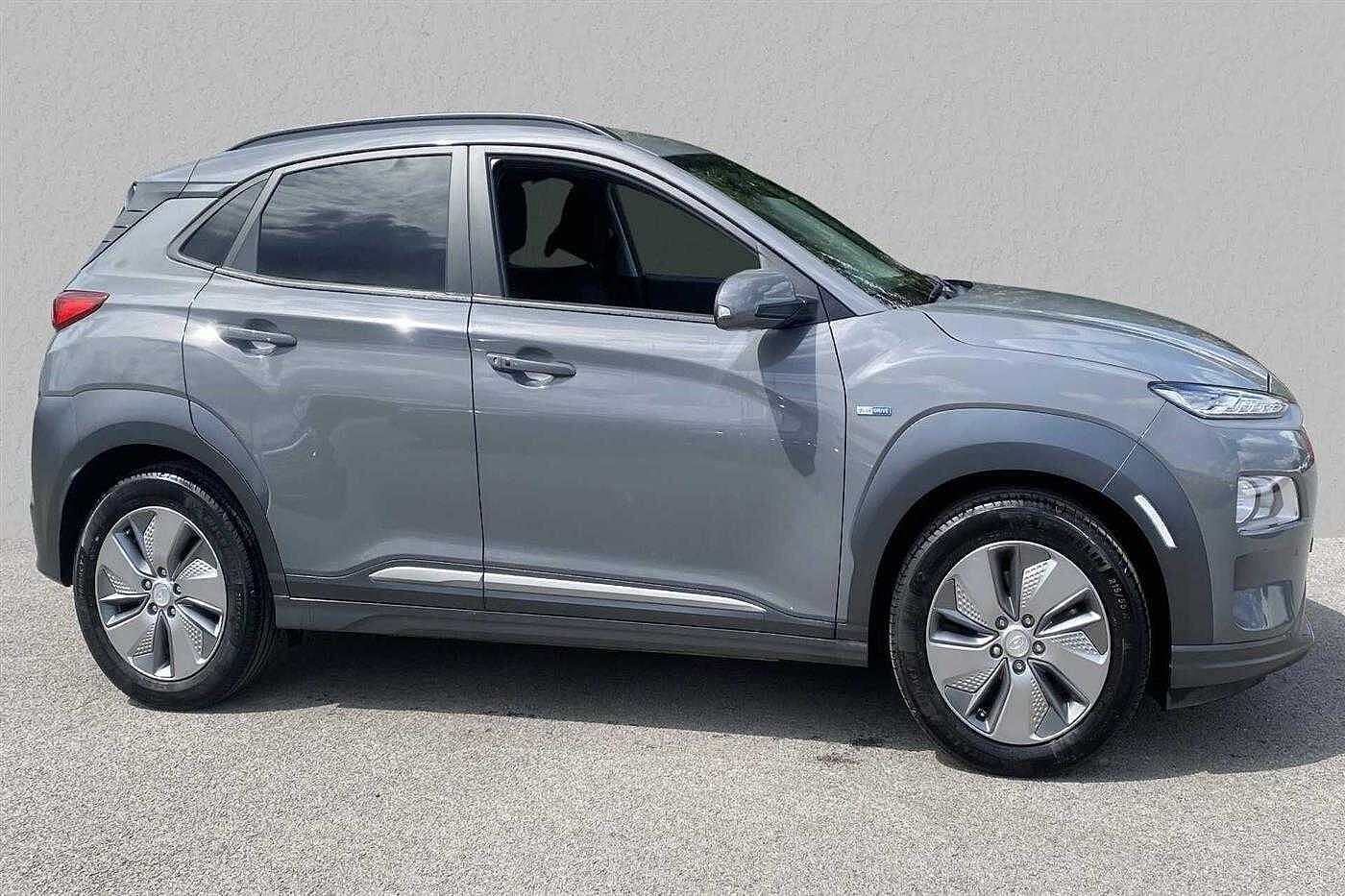 Hyundai KONA Electric SUV E (150kw) Premium finished in Amazon Grey with black cloth matching interior. Specification includes anti-lock brakes, climate control., power-assisted steering, airbags., alloy wheels (17in), cruise control., satellite navigation, computer, touch screen monitor (touch screen monitor), tinted glass (rear windows), electric mirrors., mirrors external (electric/heated), immobiliser, rear wash/wipe (rear), rain sensor, power steering, steering wheel mounted controls (audio), adaptive cruise control (adaptive cruise control), adjustable steering column/wheel (rake/reach), air bag driver, air bag passenger, air bag side (front side & front curtain), automatic lights, bluetooth, body coloured bumpers, central door locking (key), centre rear seat belt, dab digital radio, electric parking brake (electric parking brake), electric windows (front/rear), electronic brake force distribution, electronic stability programme, exterior lighting (led daytime running lights), front & rear parking sensors, head restraints (front/rear), heated rear screen, isofix, key (keyless entry), keyless entry, mirrors internal (automatic dimming rear view), on-board monitor (unspecified), parking aid (rear parking camera), rear parking sensors, reversing camera, roof rails, seat height adjustment (driver/passenger), seat lumbar support (driver electric), seating capacity (five seats), sound processor (amplifier), speakers (nine), speed limiter., steering wheel leather, sun visor, third brake light, tyre pressure control, tyre repair kit, usb connectivity, voice activated controls and windscreen shadeband.